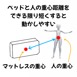 もう少し詳しく解説すると、自分の重心とマットレスの重心の距離を出来るだけ近づけるようにすることです。そうすればマットレスに力が入りやすくなり、移動しやすくなるのです。
