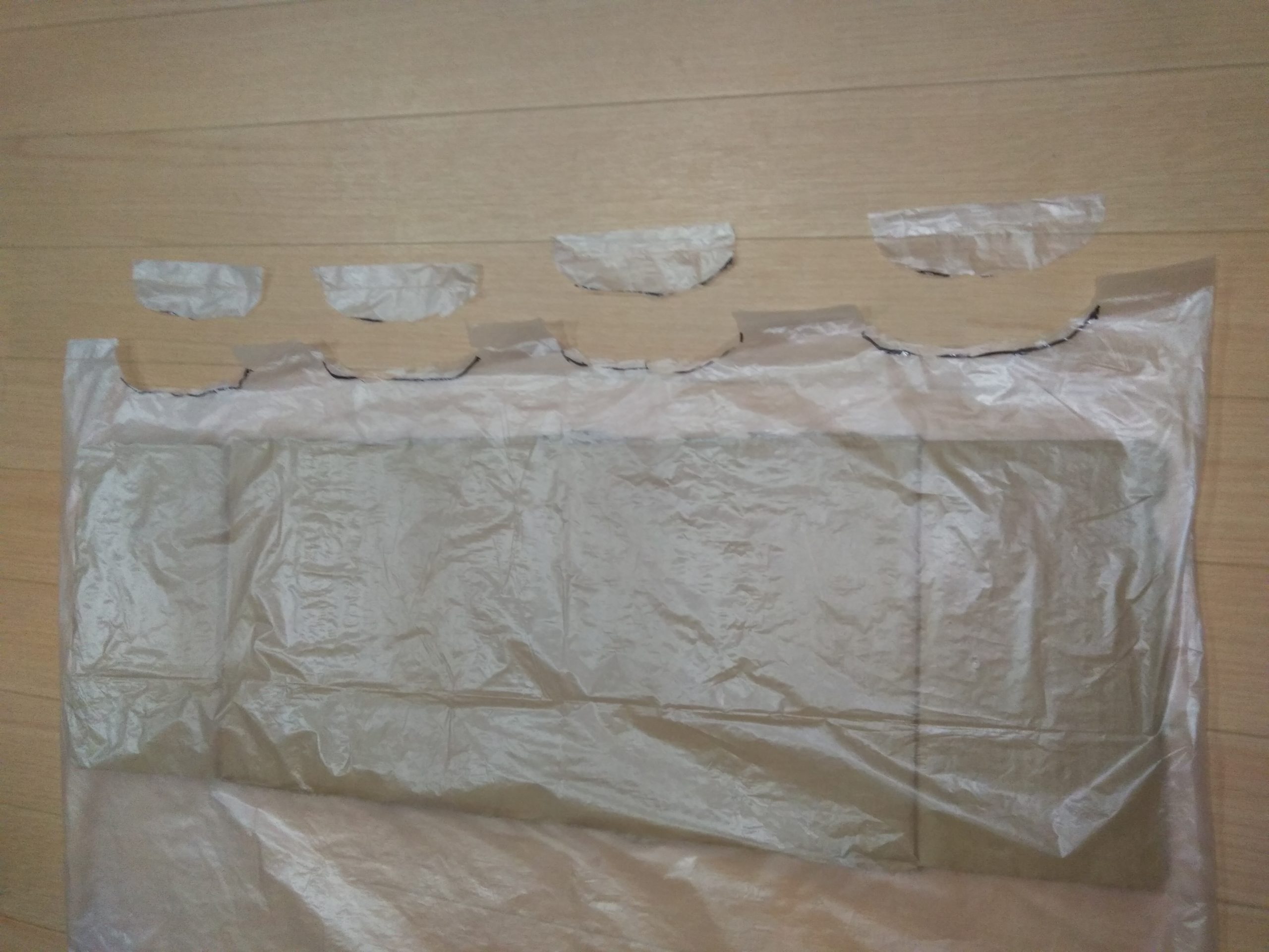 - 風のダクトを作るためにビニール袋(45リットル)の端を4か所切ります。全部切らないでください。