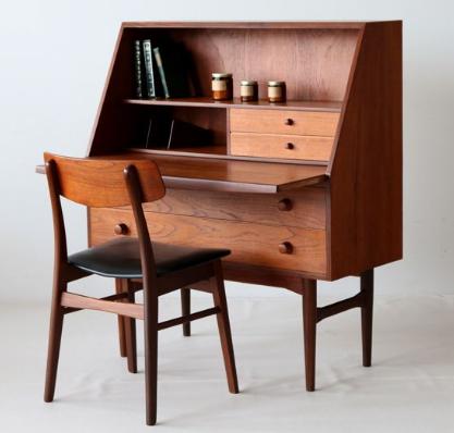 ライティングビューローは、机と戸棚が一体になった家具で、戸棚の扉を開けると机として使える家具です。使わない時は天板を閉めることでコンパクトになるので部屋がスッキリする合理的な家具なのです。